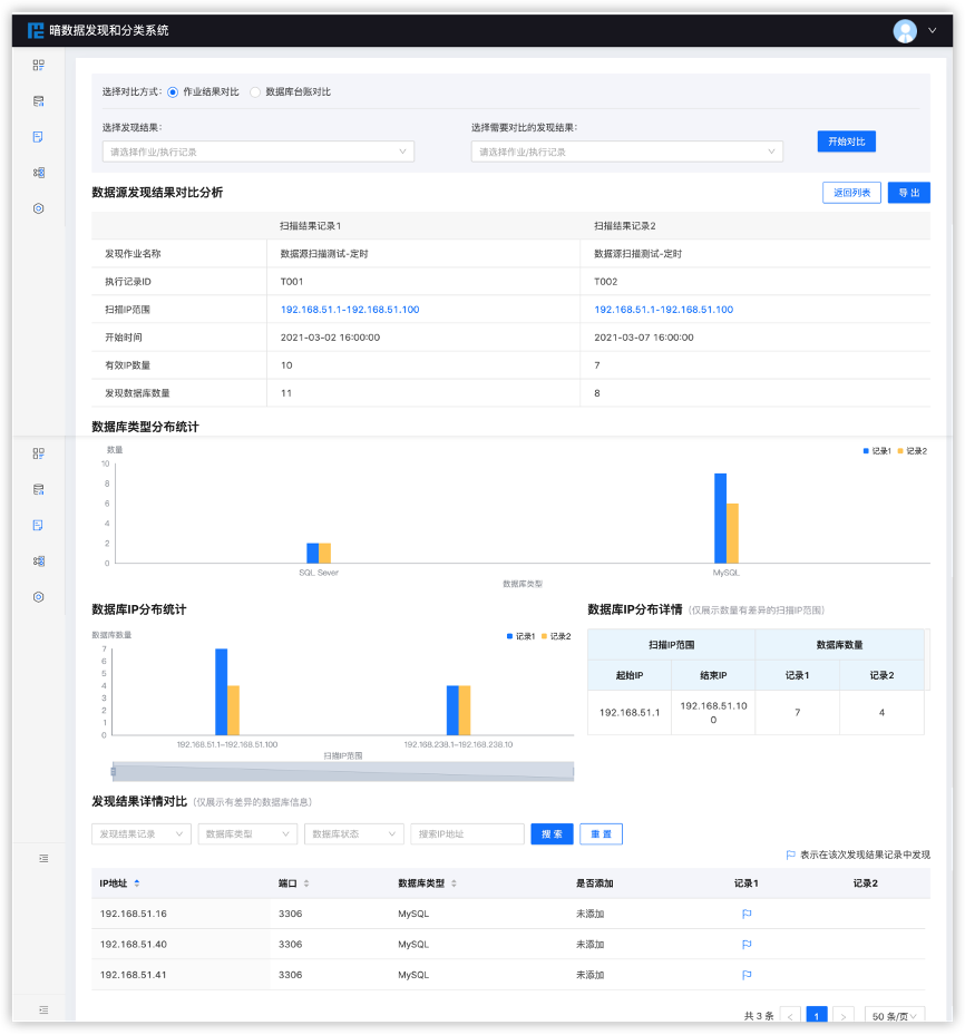 通过比对分析不同时间的数据源发现结果,及时了解数据库的变化情况;通过与用户上传的数据库台账信息比对,定位数据资产信息变化。