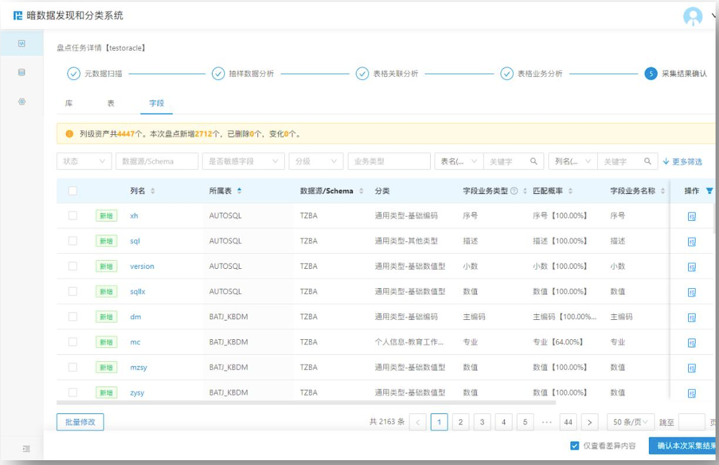 暗数据发现和分级分类系统内置完善和健壮的数据口径、标准和规则,可自动对多类型库的元数据进行扫描、梳理,自动识别数据的格式、技术类型和业务类型。