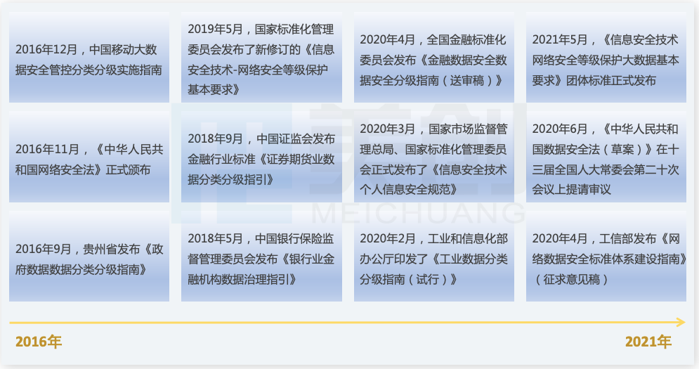 近年来,关于数据分类分级相关的法律法规及国家、各地方、各行业标准陆续出台。《中华人民共和国数据安全法(草案)》明确提出,国家根据数据在经济社会发展中的重要程度以及篡改、破坏、泄露或非法获取、非法利用造成的危害程度,对数据实行分类分级保护。“十四五”规划纲要也重点强调数据安全保护和数字经济安全保障,提出要“推动完善适用于大数据环境下的数据分类分级保护制度”。