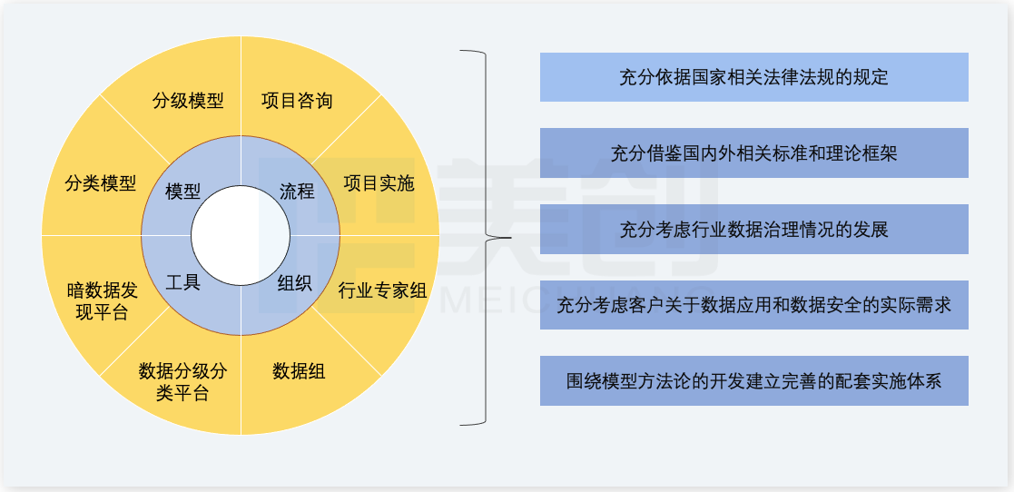 为满足国家所提出的数据分类分级要求,保证分类分级的规范性,同时有效提升分类分级的准确性和效率,suncitygroup太阳集团在结合自身数据安全经验及对相关法律法规、国内外标准研究基础上,形成了一套可操作落地的方法论和配套软件工具,总体设计原则如下图: