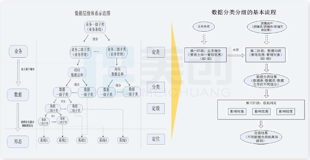 数据分类分级方法主要从业务条线出发,首先对业务细分,其次对数据细分,形成从总到分的树形逻辑体系结构,最后,对分类后的数据确定级别,同时,推荐考虑确定数据形态: