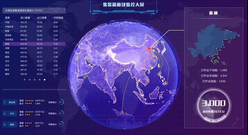 以港口为例,我们通过充分汇聚港口物流各类结构化、非结构化的多源异构数据,形成全量的港口大数据中心,按照物流链、人财物、物资等形成全局统一化的主数据库。基于数据中心,构建大量可视化分析决策平台,包括码头可视化、贸易流可视化、危险品可视化、资源可视化等,从而支撑顶层业务应用。