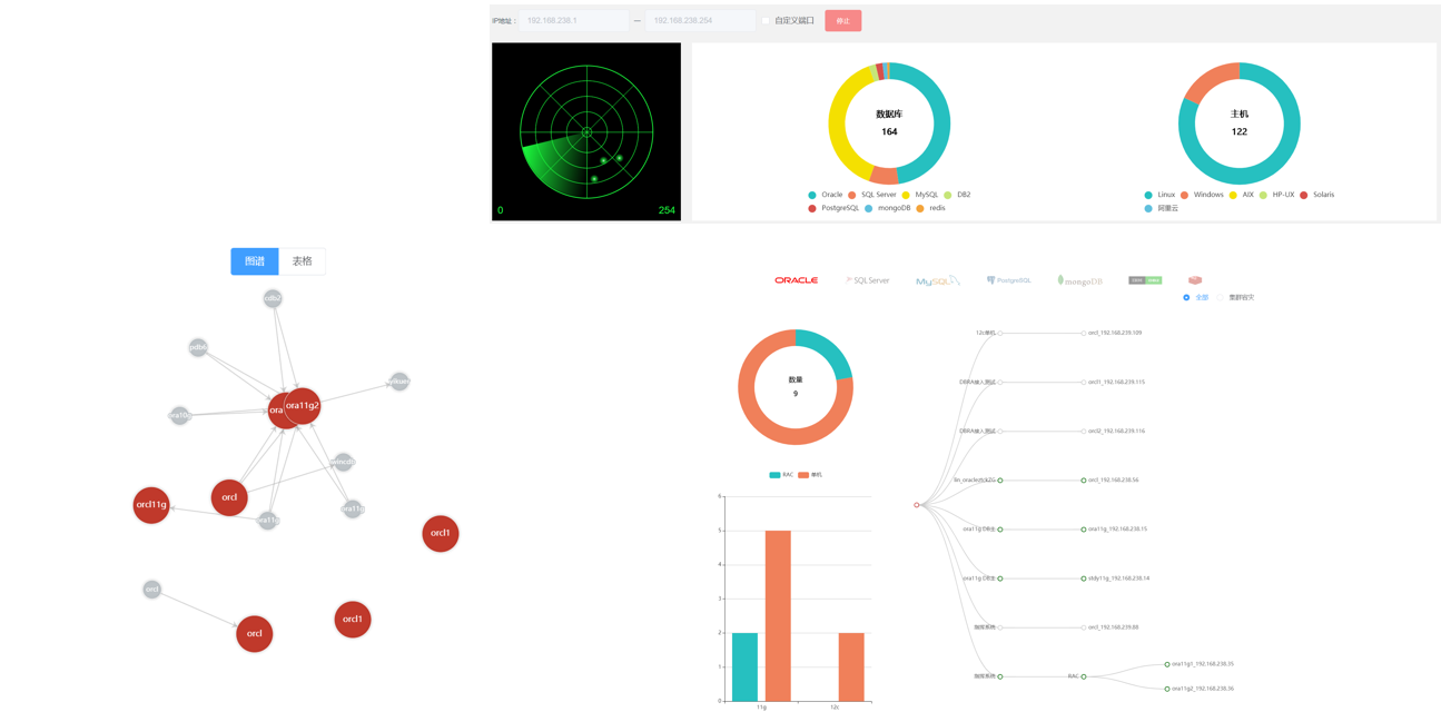 通过数据库运行安全管理平台提供的资产分析工具,自动分析统计平台内所有数据库的不同版本、单机、集群等的数量,并以图形化展示,让运维人员直观快速地掌握数据库资产的分类统计,为资产管理工作提供便利。