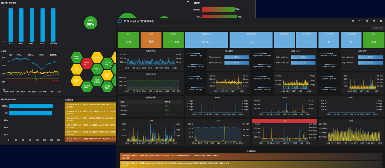 通过数据库运行安全管理平台的数据库监控功能,针对不同业务的数据库类型,实现对数据资产的聚合监控及单一精细化监控,“从数据库可用性、性能、错误、变更、可靠性、数据资源SQL执行生命周期、主机资源”等维度系统展示健康运行状态,实现不同内容板块的告警关联。同时建立“健康度、可用度、繁忙度”运行画像模型,实现数据库主动运维。