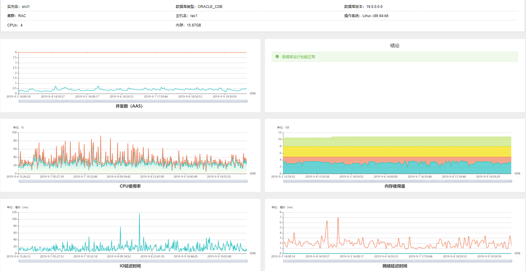 通过数据库运行安全管理平台提供的性能分析工具从数据库的并发数、CPU使用率、内存使用量、IO延迟时间、网络延迟时间5个维度,全面地分析数据库各资源使用情况,并给出数据库性能是否正常结论,让运维人员以最快时间了解到自己关注的数据库对象性能是否良好。