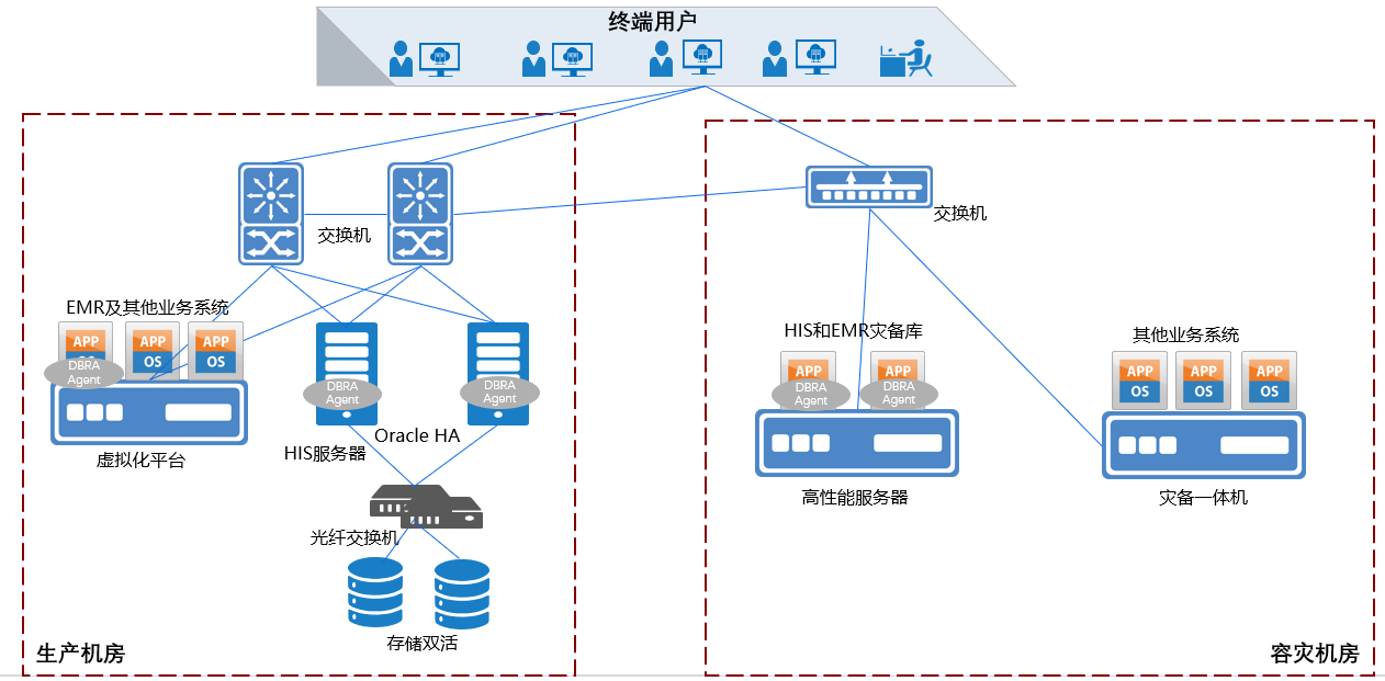 作为辽宁省三大区域医疗中心之一,医院近年来业务系统迅速拓展、数据量不断增加,信息系统庞大而复杂。目前,医院HIS系统采用物理主机做的HA模式,数据库为ORACLE 11G;其他系统均部署在虚拟化平台中。一旦核心机房故障,将会导致与其相关的业务均无法开展,更有可能会出现整体IT系统的全面崩溃,所有业务均无法开展,甚至会造成毁灭性的业务数据永久性丢失。