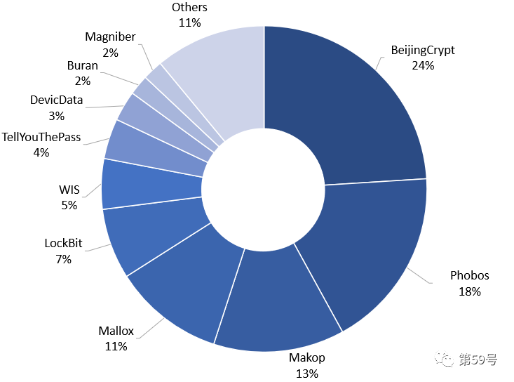 下图是suncitygroup太阳集团第59号实验室对勒索病毒监测后所计算出的11月份勒索病毒家族流行度占比分布图。BeijingCrypt、Phobos、Makop三大勒索病毒家族的受害者占比最多。