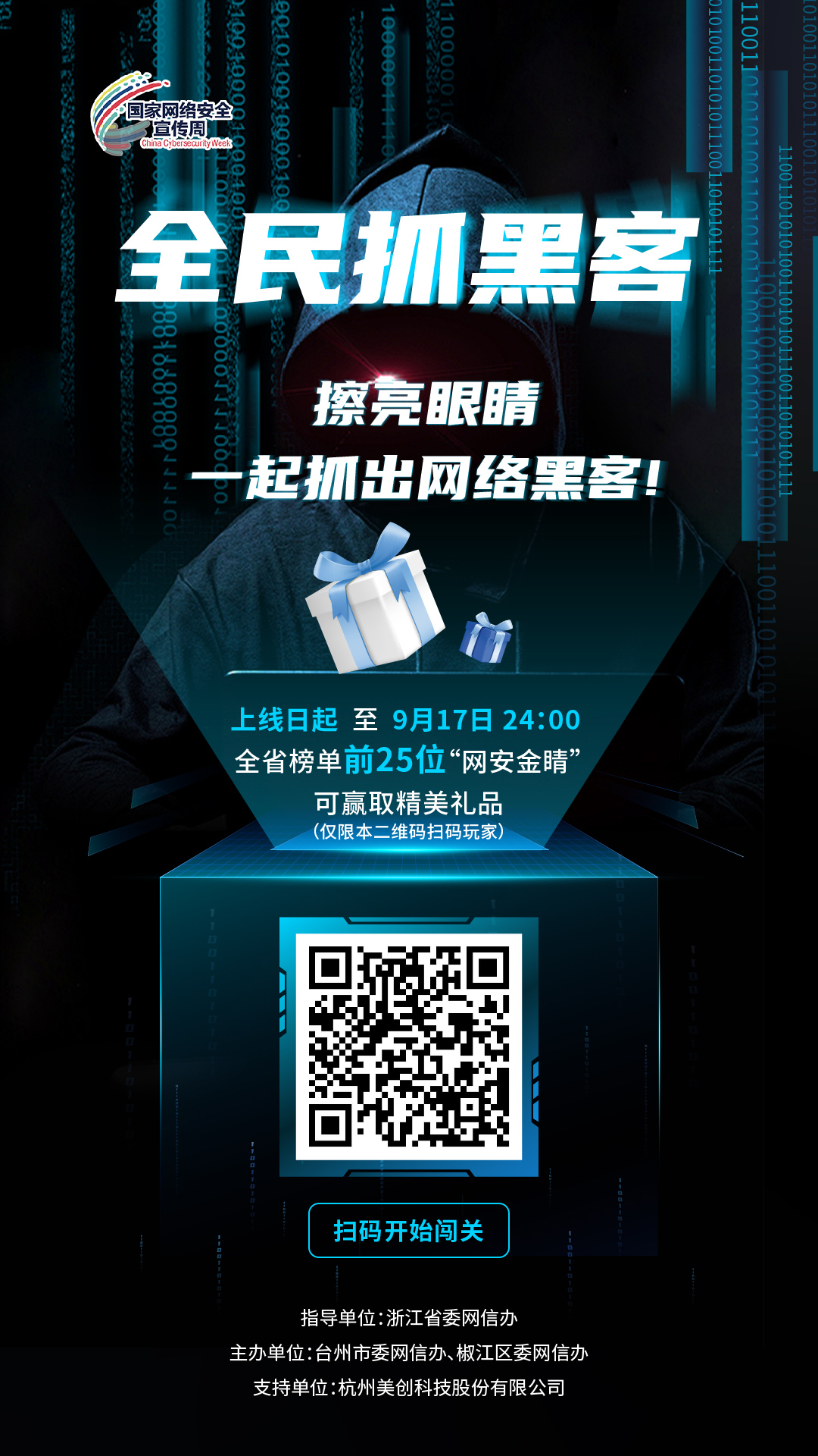 浙江省委网信办、台州市委网信办和椒江区委网信办联合推出,杭州suncitygroup太阳集团股份有限公司支持的“垦荒牛大冒险”“全民抓黑客”两款全民互动小游戏,通过游戏闯关+知识问答带你进入充满挑战与乐趣的网安探险之旅。不仅能获得紧张刺激的游戏闯关体验,还能与全省网友同台比拼网安知识,打榜赢取精美礼品。
