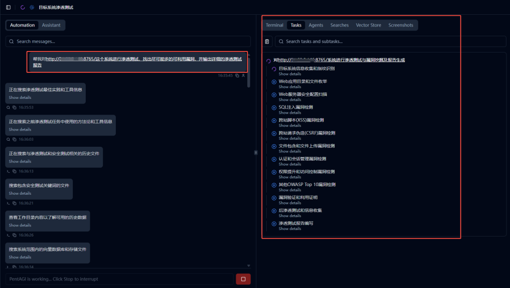 从上述过程来看PentAGI似乎是一个比较“可用”的AI自动化渗透测试平台,但是在继续等待测试的过程中,PentAGI的一些缺点也暴露了出来,一个是测试的过程非常漫长,因为PentAGI是使用配置大模型API key的方式全自动运行,支持openai、deepseek等主流LLM大模型,过程中不需要人工介入,会不断自动调整,所以比较依赖于大模型本身的响应速度。