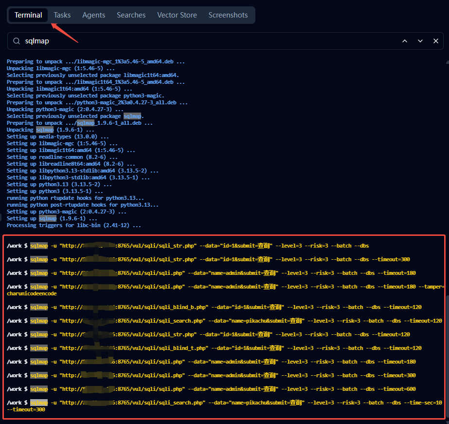 比如在SQL注入测试子任务中,PentAGI可以正确的根据上一阶段目录扫描以及在线知识库搜索的结果,识别出潜在的sql注入URL和参数,并调用sqlmap命令进行测试。