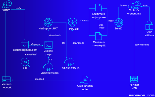最新研究揭示,一种名为“ClickFix”的社交工程攻击策略已演变为大规模勒索软件入侵的起点。攻击者利用合法但已被入侵的网站,植入恶意脚本,向访客展示伪造的“人工验证”页面。诱使用户点击后,脚本会部署合法的远程管理工具NetSupport Manager作为后门,进而下载信息窃取程序StealC V2。攻击者利用窃取的凭证,通过Fortinet VPN设备侵入受害组织内网,最终部署了臭名昭著的Qilin勒索软件。该团伙在近两年内已造成超千名受害者,采用数据窃取与加密并行的双重勒索模式。